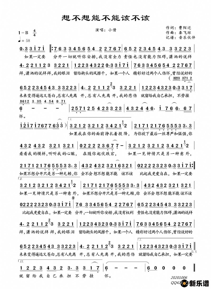 小倩演唱的想不想能不能该不该歌词,想不想能不能该不该简谱.