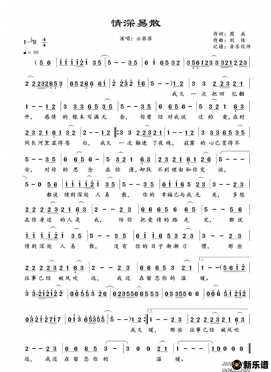 云菲菲演唱的情深易散歌词,情深易散简谱.