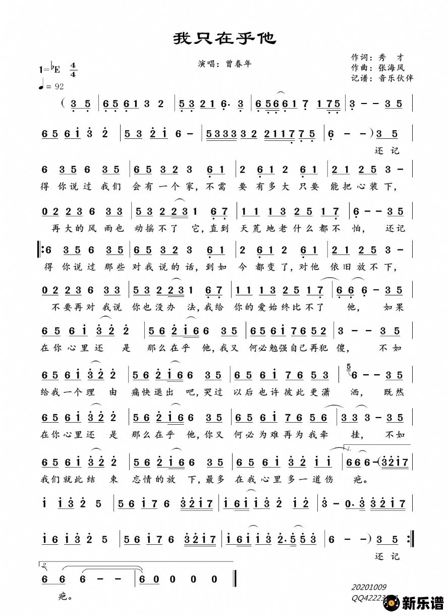 曾春年演唱的我只在乎他歌词,我只在乎他简谱.