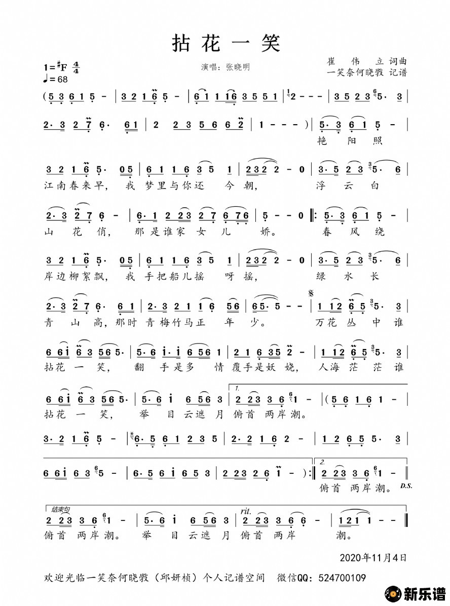 《拈花一笑(男版)》简谱 张晓明-一笑奈何晓斅制谱
