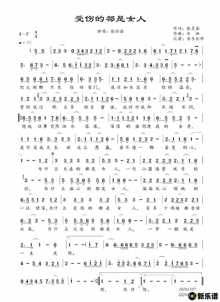 张怡诺演唱的受伤的都是女人歌词,受伤的都是女人简谱.