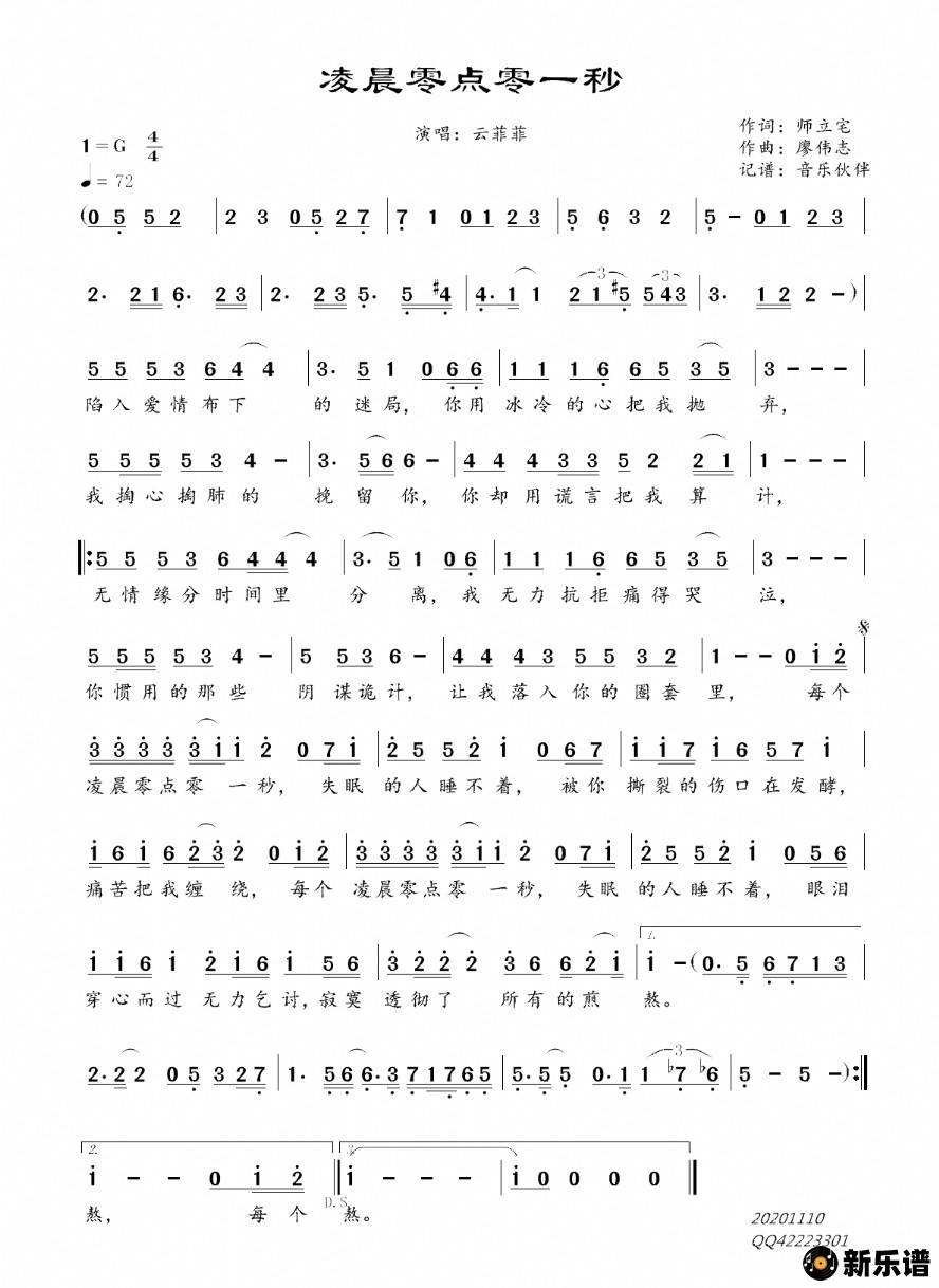 云菲菲演唱的凌晨零点零一秒歌词,凌晨零点零一秒简谱.