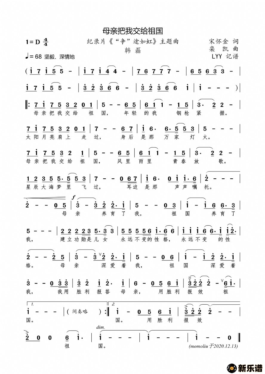 母亲把我交给祖国(纪录片《“争”途如虹》主题曲)韩磊 韩磊演唱的母亲把我交给祖国(纪录片《“争”途如虹》主题曲)歌词,母亲把我交给祖国(纪录片《“争”途如虹》主题曲)简谱. 此简谱由新乐谱会员 momoliu 上传