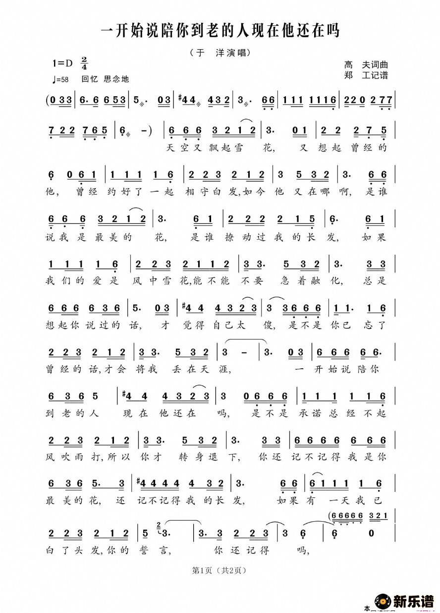 一开始说陪你到老的人现在他还在吗于洋 于洋演唱的一开始说陪你到老的人现在他还在吗歌词,一开始说陪你到老的人现在他还在吗简谱. 天空又飘起雪花又想起曾经的他曾经约好了一起相守白发如今他又在哪啊是谁说我是最美的花是谁撩动过我的长发如果我们的爱是风中雪花能不能不要急着融化总是想起你说过的话才觉得自己太傻是不是你已忘了曾经的话才会将我丢在天涯一开始说陪你到老的人现在他还在吗是不是承诺总经不起风吹雨打所以你才转身退下你还记不记得我是你最美的花还记不记得我的长发如果有一天我已白了头发你的誓言 你还记得吗是谁说我是最美的花是谁撩动过我的长发如果我们的爱是风中雪花能不能不要急着融化一开始说陪你到老的人现在他还在吗是不是承诺总经不起风吹雨打所以你才转身退下你还记不记得我是你最美的花还记不记得我的长发如果有一天我已白了头发你的誓言 你还记得吗一开始说陪你到老的人现在他还在吗是不是身边已有了现在的她对她说了同样的话如果我真的是你最美的花你怎么能忍心退下如果有一天你也白了头发是否还记得… 我是你最美的花 此简谱由新乐谱会员 郑工 上传