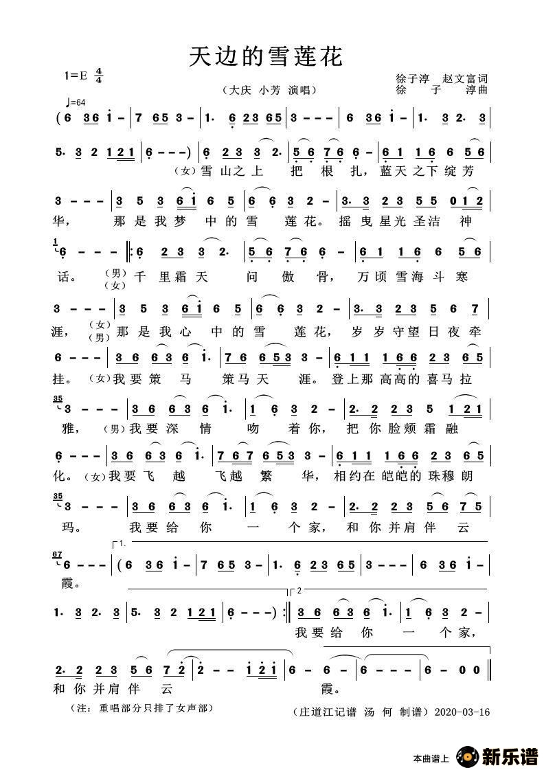 大庆/小芳演唱的天边的雪莲花歌词,天边的雪莲花简谱.