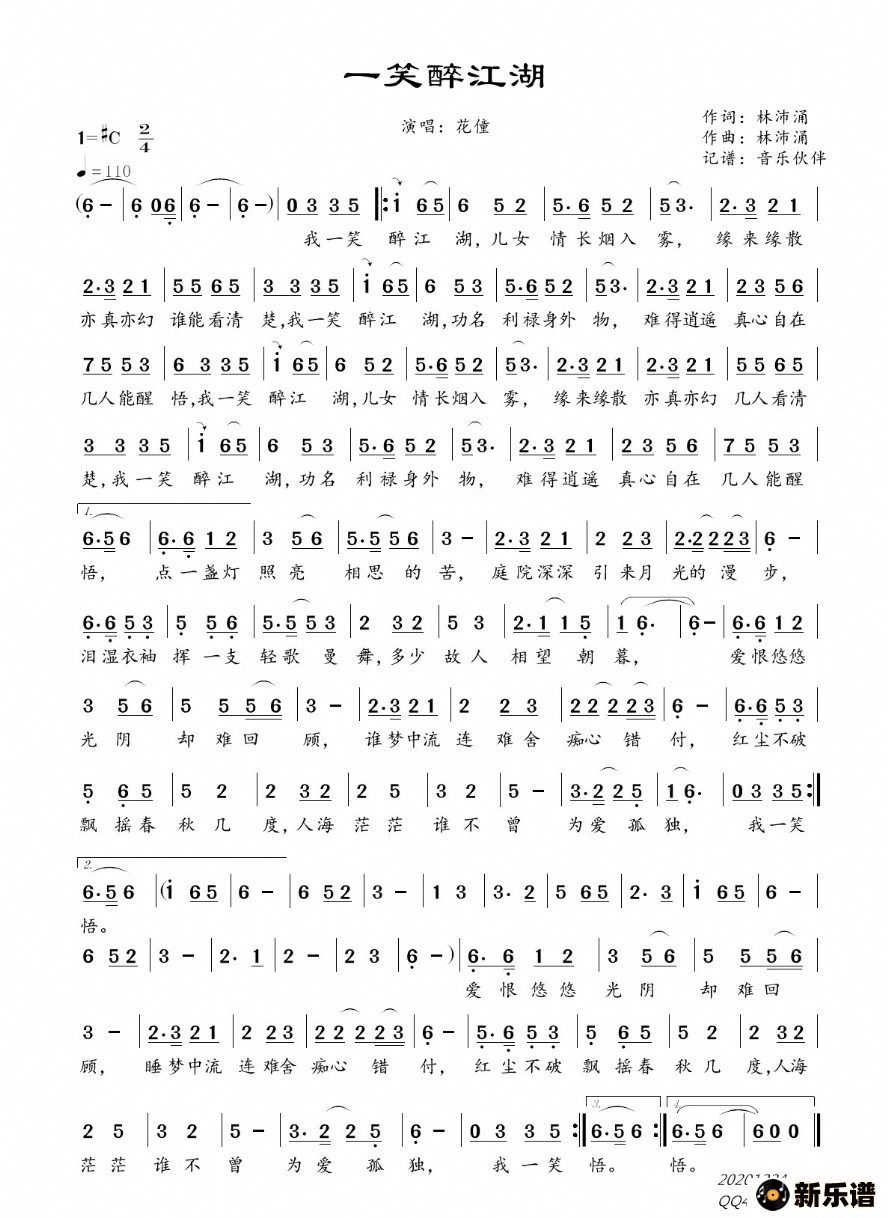 花僮演唱的一笑醉江湖歌词,一笑醉江湖简谱.