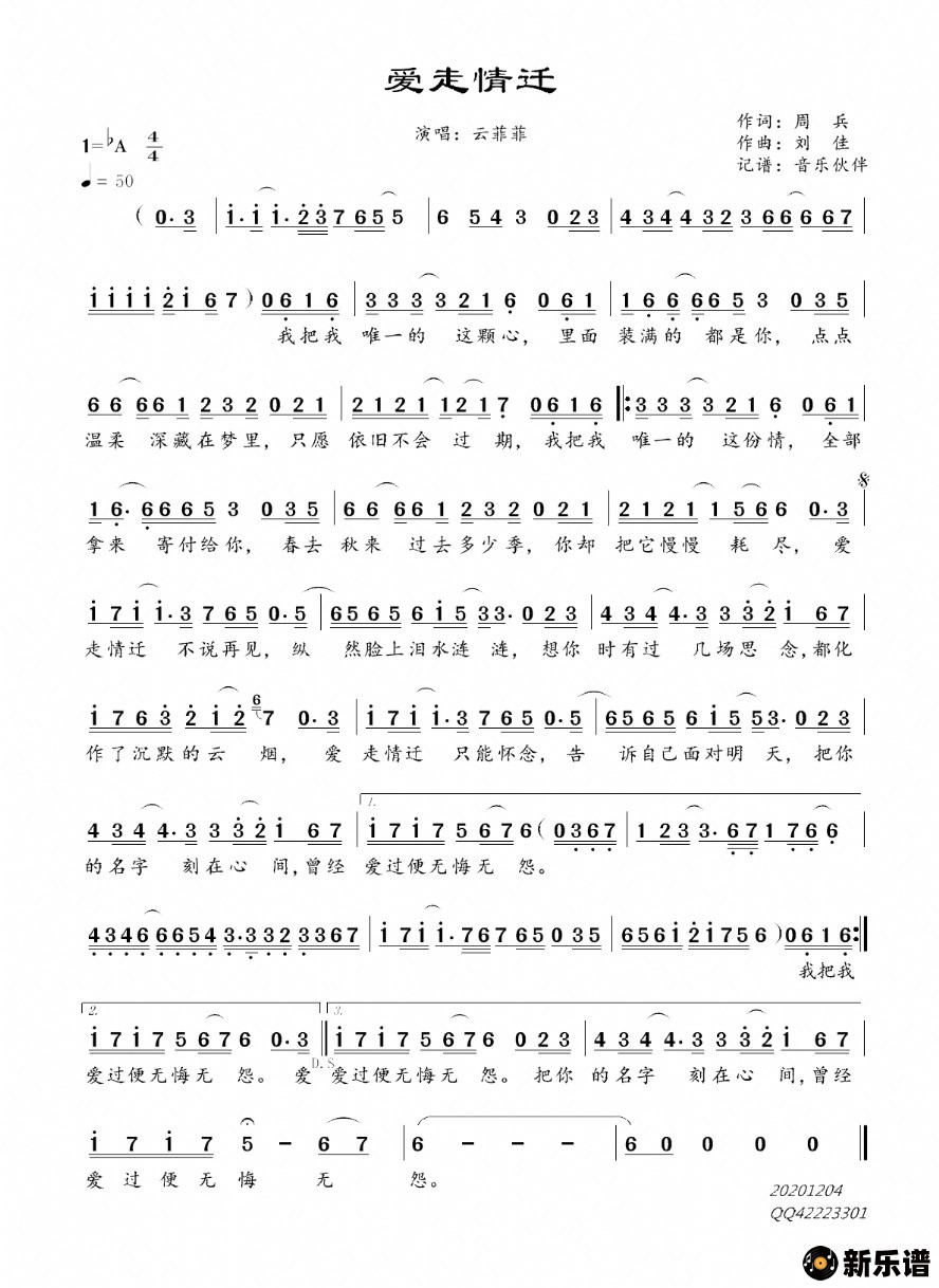 云菲菲演唱的爱走情迁歌词,爱走情迁简谱.