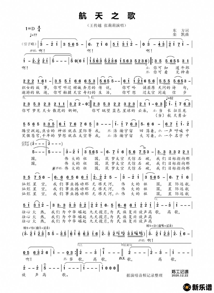《航天之歌》简谱 王传越、张莉莉-郑工制谱