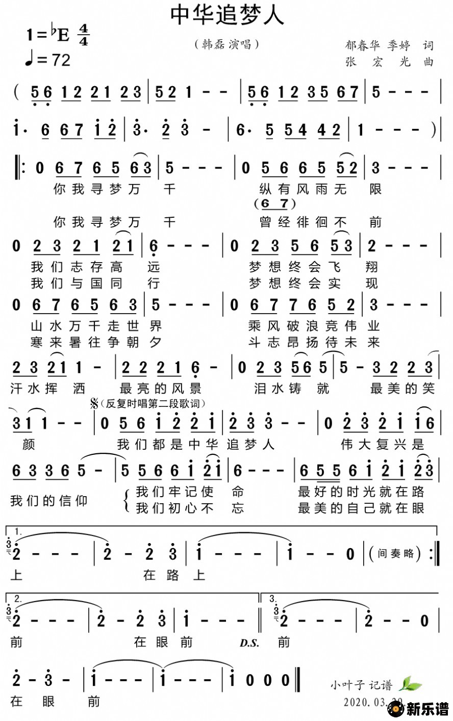 《中华追梦人》简谱 韩磊-小叶子制谱