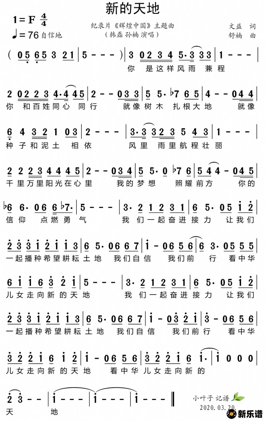 《新的天地(纪录片《辉煌中国》主题曲)》简谱 韩磊/孙楠-小叶子制谱