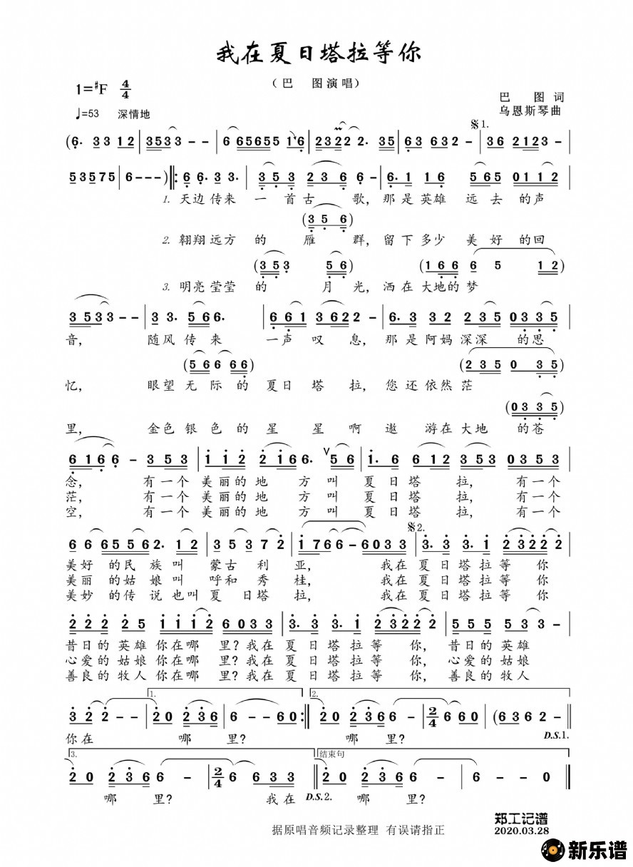 《我在夏日塔拉等你》简谱 巴图-郑工制谱