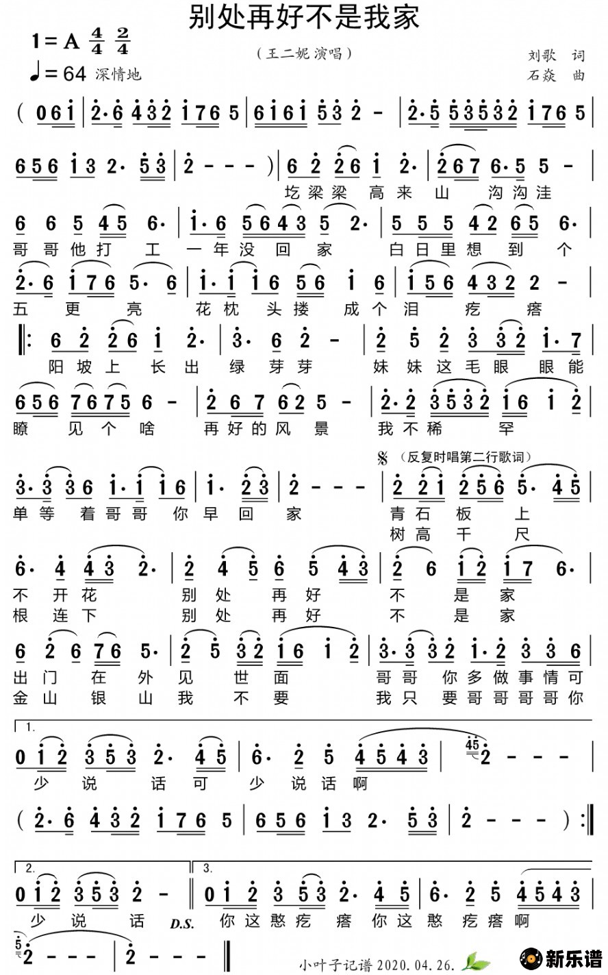《别处再好不是我家》简谱 王二妮-小叶子制谱