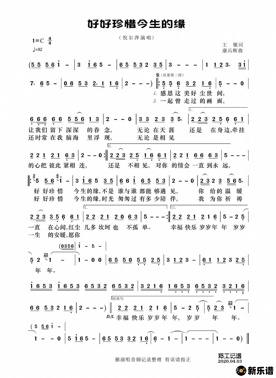 《好好珍惜今生的缘》简谱 倪尔萍-郑工制谱