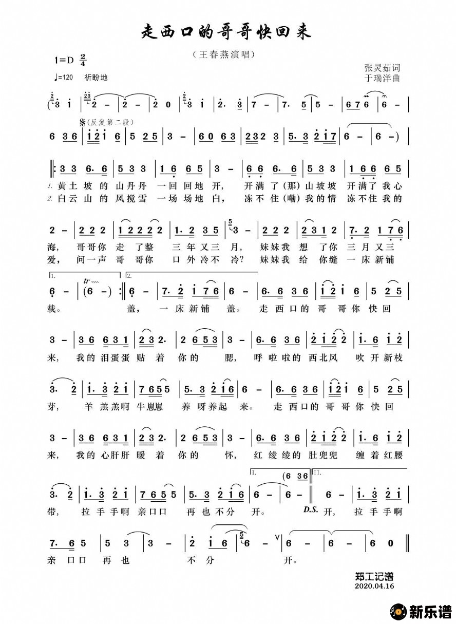 《走西口的哥哥快回来》简谱 王春燕-郑工制谱