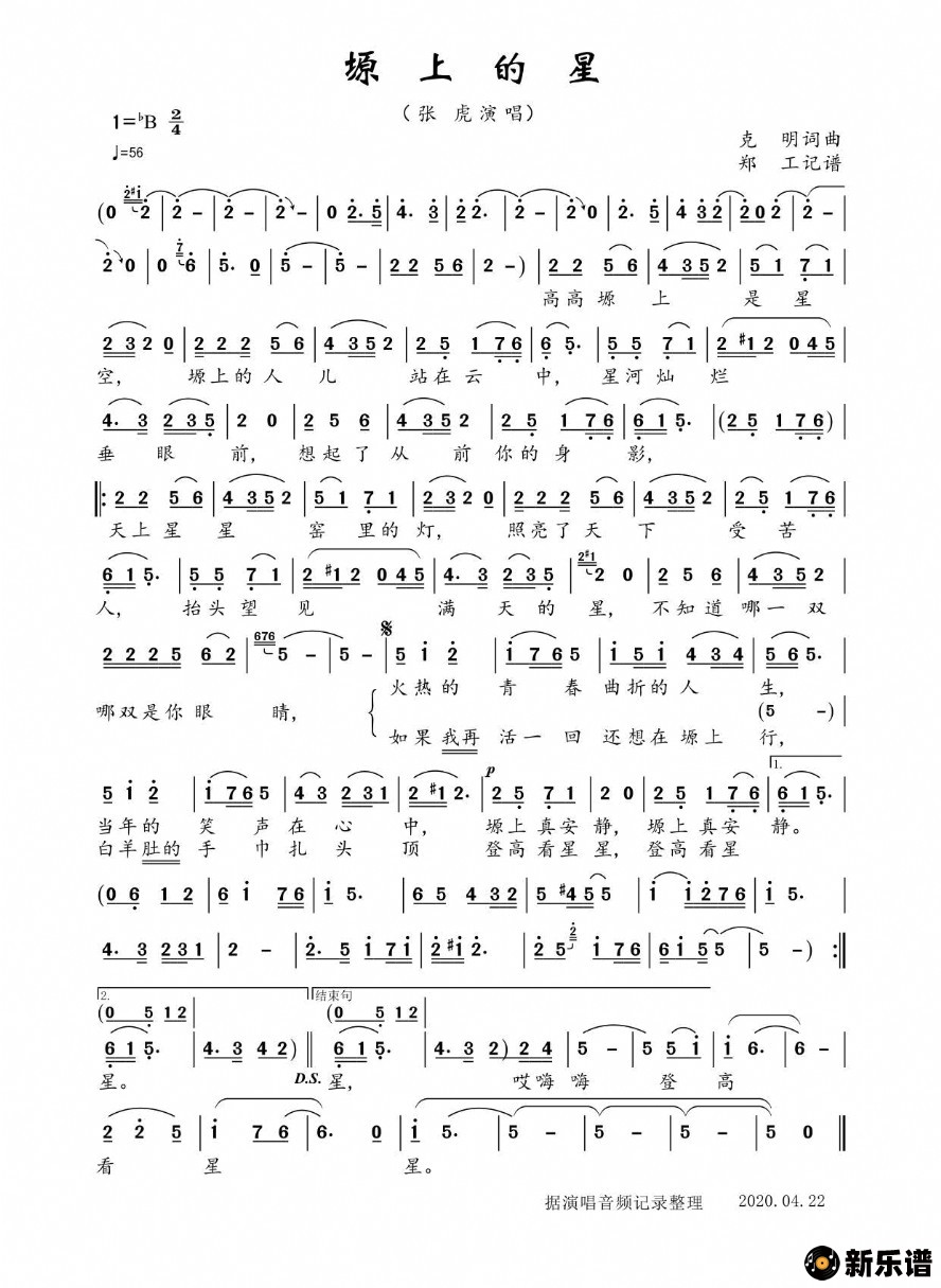 《塬上的星(陕北曲调风格)》简谱 张虎-郑工制谱