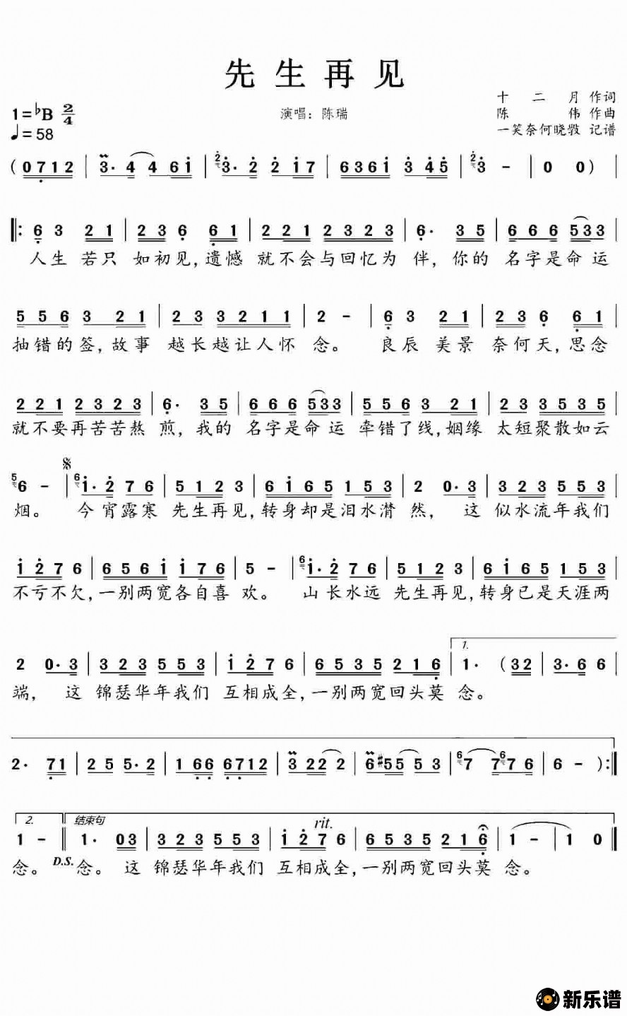 《先生再见》简谱 陈瑞-一笑奈何晓斅制谱