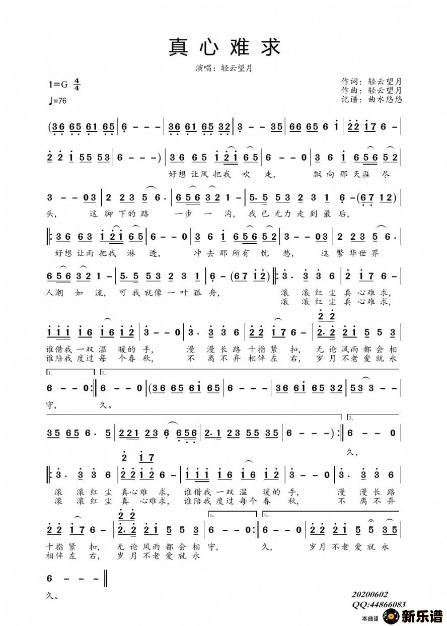 轻云望月演唱的真心难求歌词,真心难求简谱.