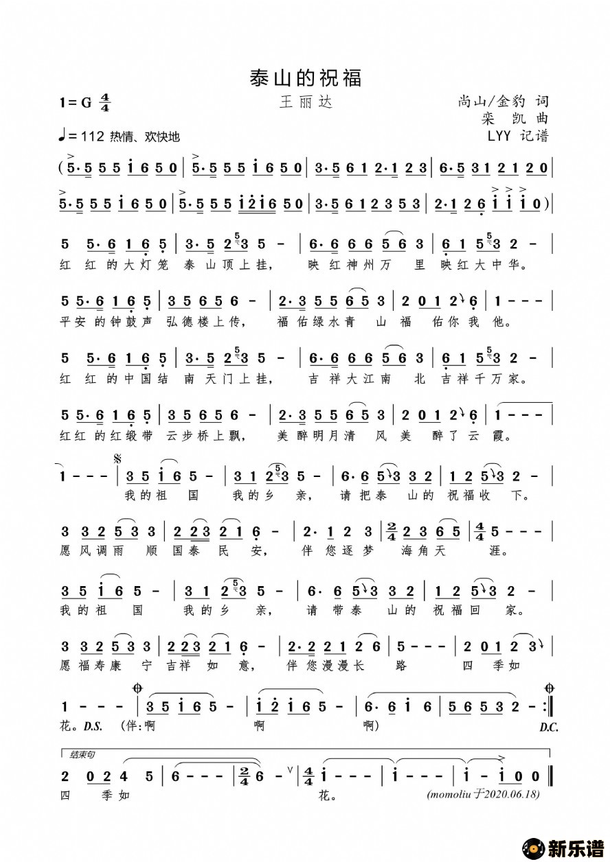 《泰山的祝福》简谱 王丽达-momoliu制谱