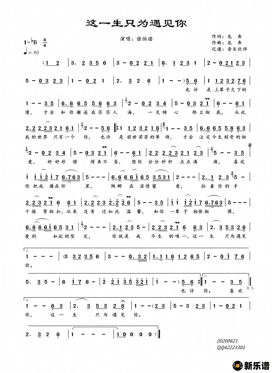 《这一生只为遇见你》简谱 张怡诺-音乐伙伴制谱