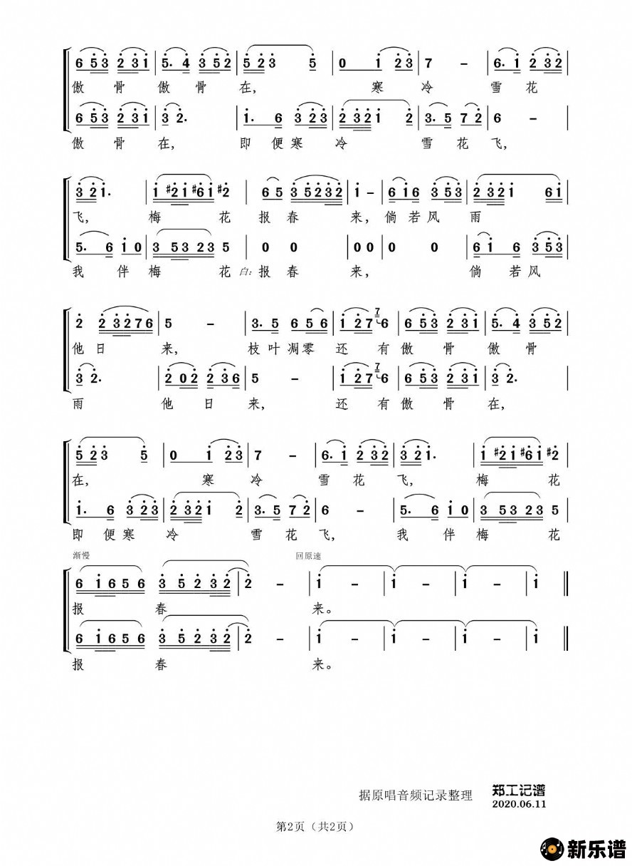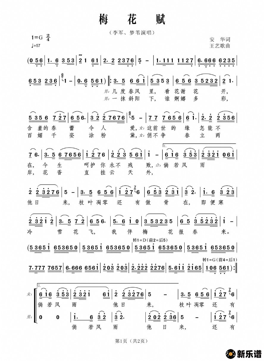 《梅花赋(男女二重唱 京歌)》简谱 李军-郑工制谱