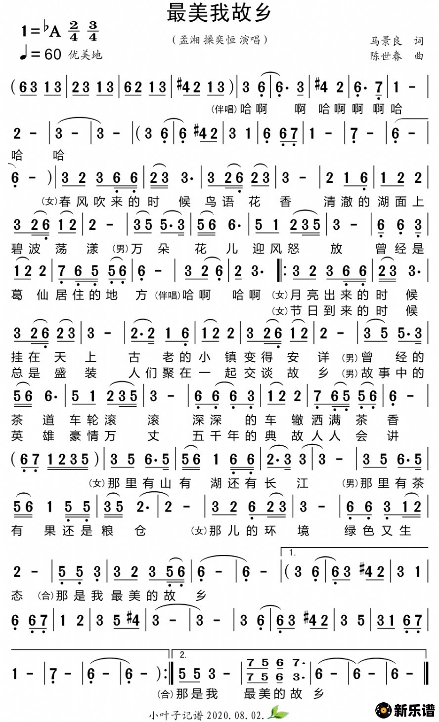 《最美我故乡》简谱 孟湘/操奕恒-小叶子制谱