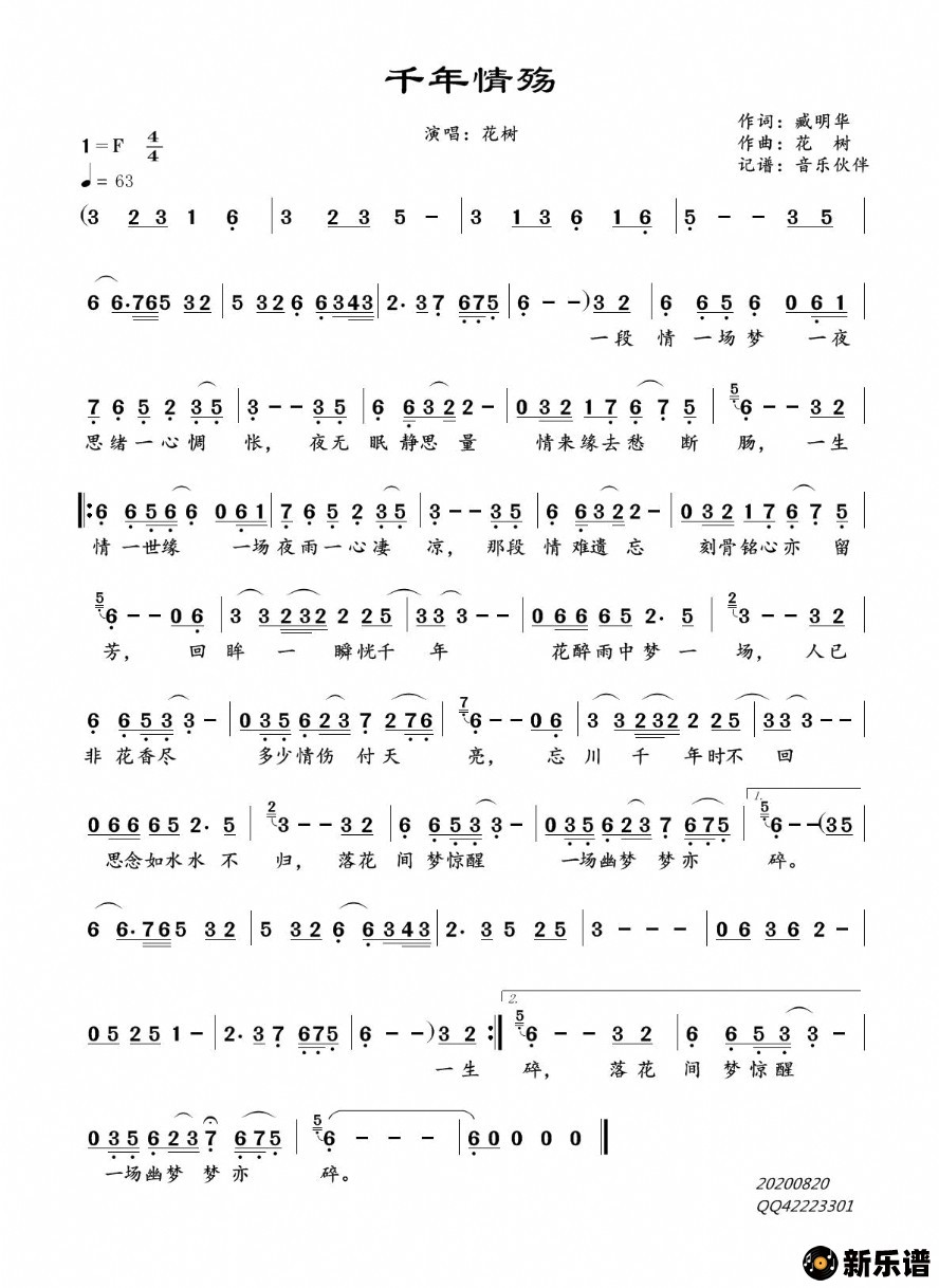 花树演唱的千年情殇歌词,千年情殇简谱.