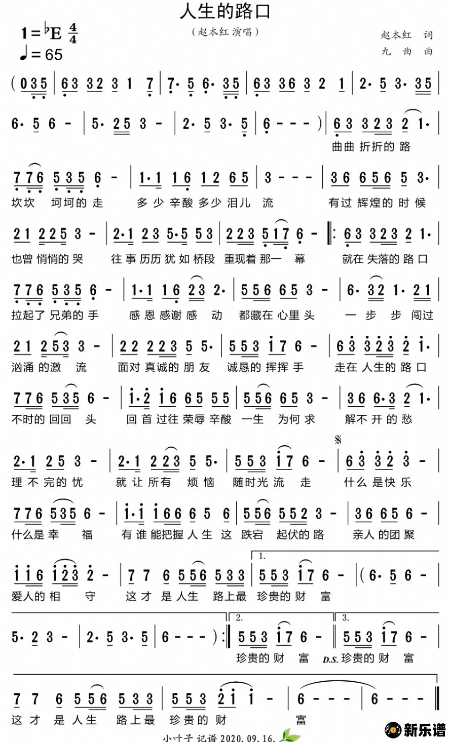 赵本红演唱的人生的路口歌词,人生的路口简谱.