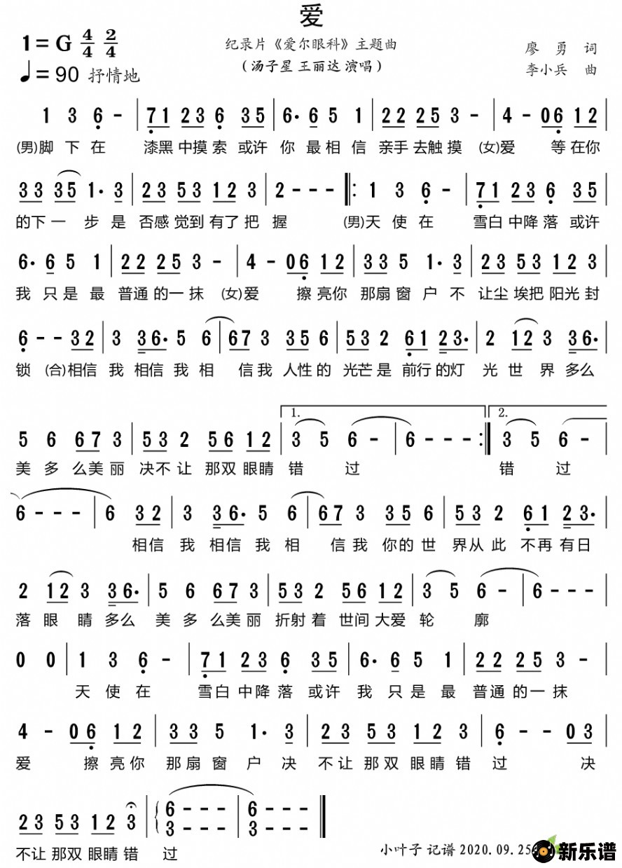 《爱(纪录片《爱尔眼科》主题曲)》简谱 汤子星/王丽达-小叶子制谱