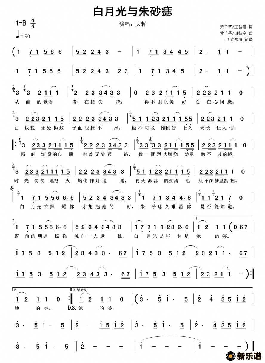大籽演唱的白月光与朱砂痣(大字版)歌词,白月光与朱砂痣(大字版)简谱.
