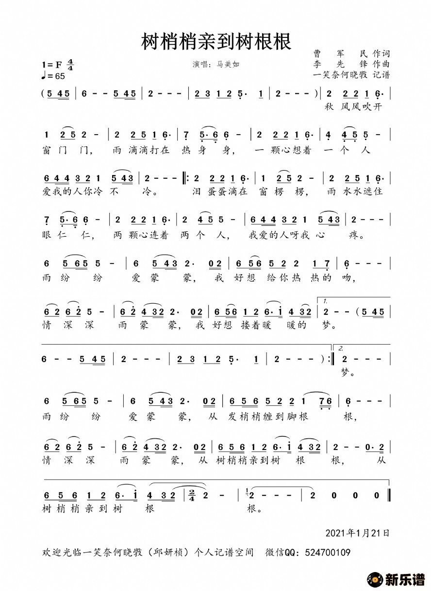 马美如演唱的树梢梢亲到树根根歌词,树梢梢亲到树根根简谱.