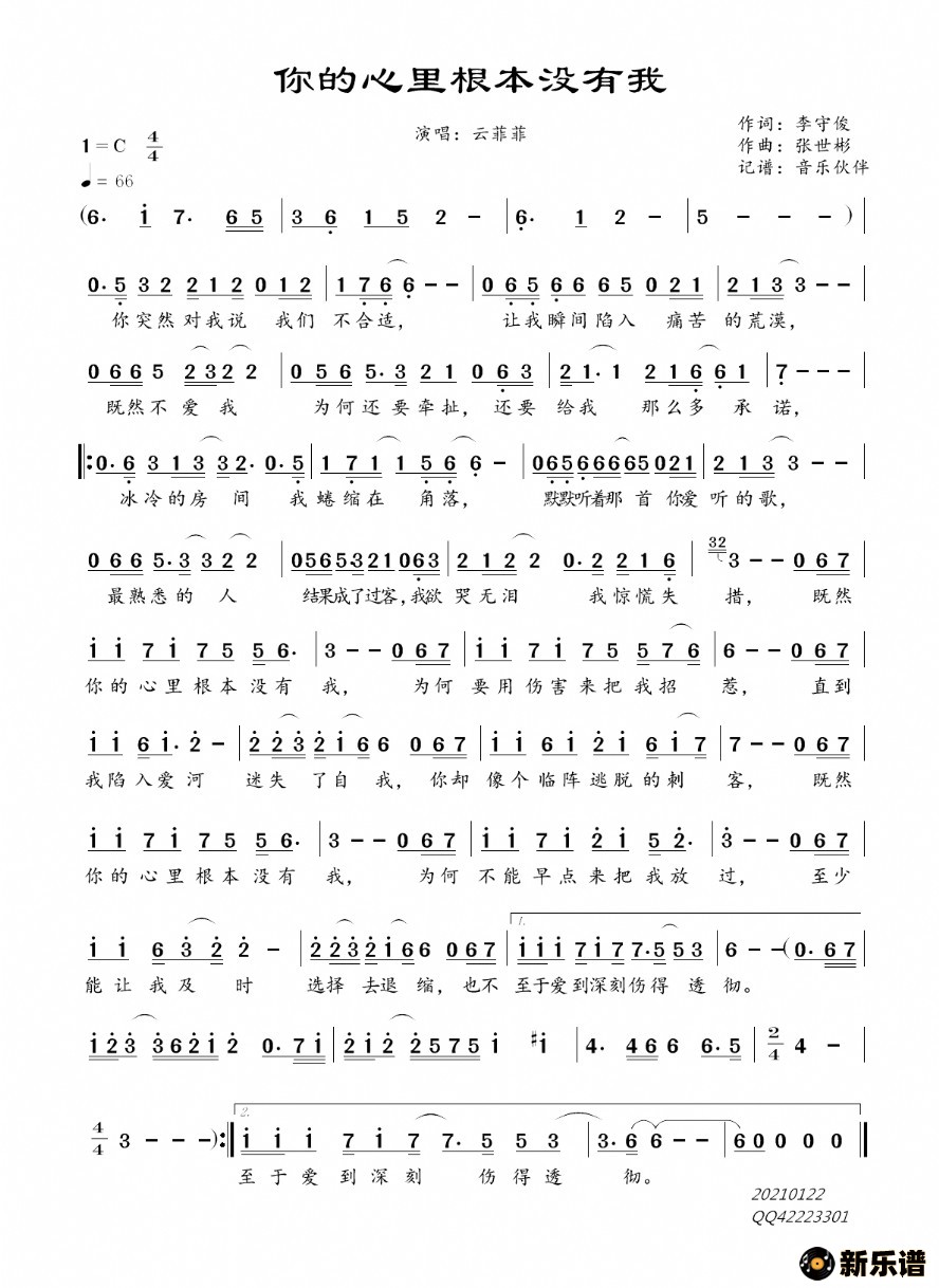 《你的心里根本没有我》简谱 云菲菲-音乐伙伴制谱