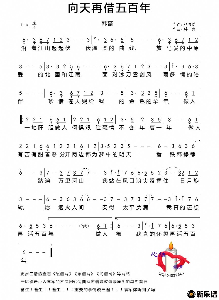 《向天再借五百年》简谱 韩磊-心烛制谱