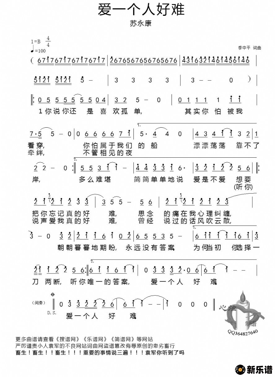 《爱一个人好难》简谱 苏永康-心烛制谱
