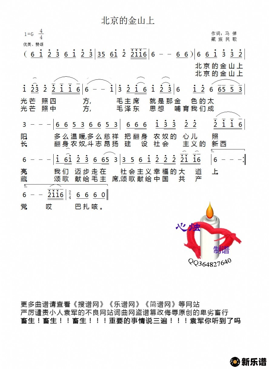 《北京的金山上》简谱 索朗旺姆-心烛制谱