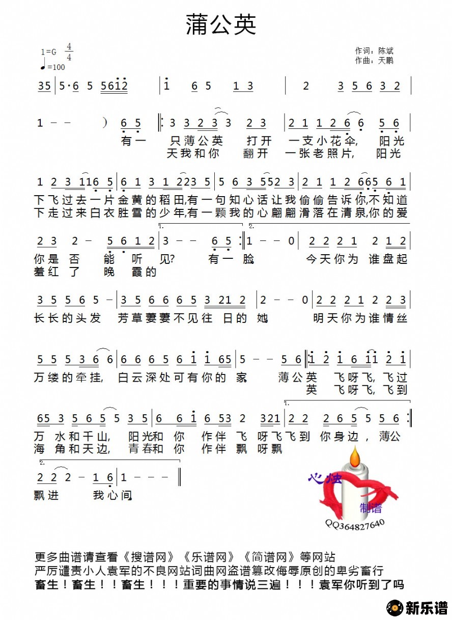 佚名演唱的蒲公英歌词,蒲公英简谱.