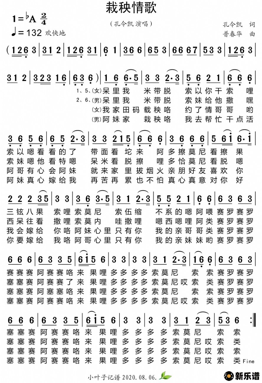 《栽秧情歌》简谱 孔令凯/普春华-小叶子制谱