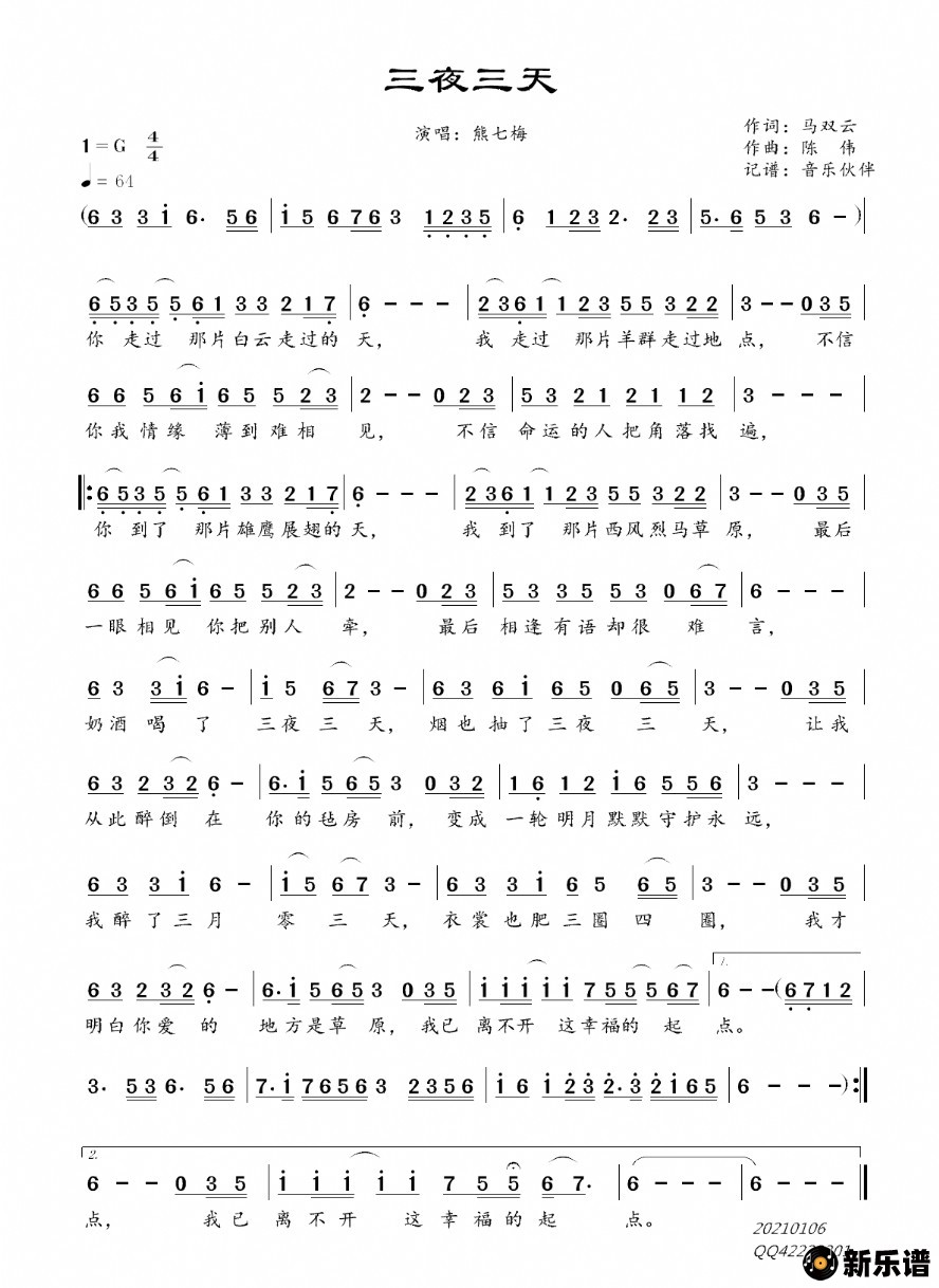 熊七梅演唱的三夜三天歌词,三夜三天简谱.