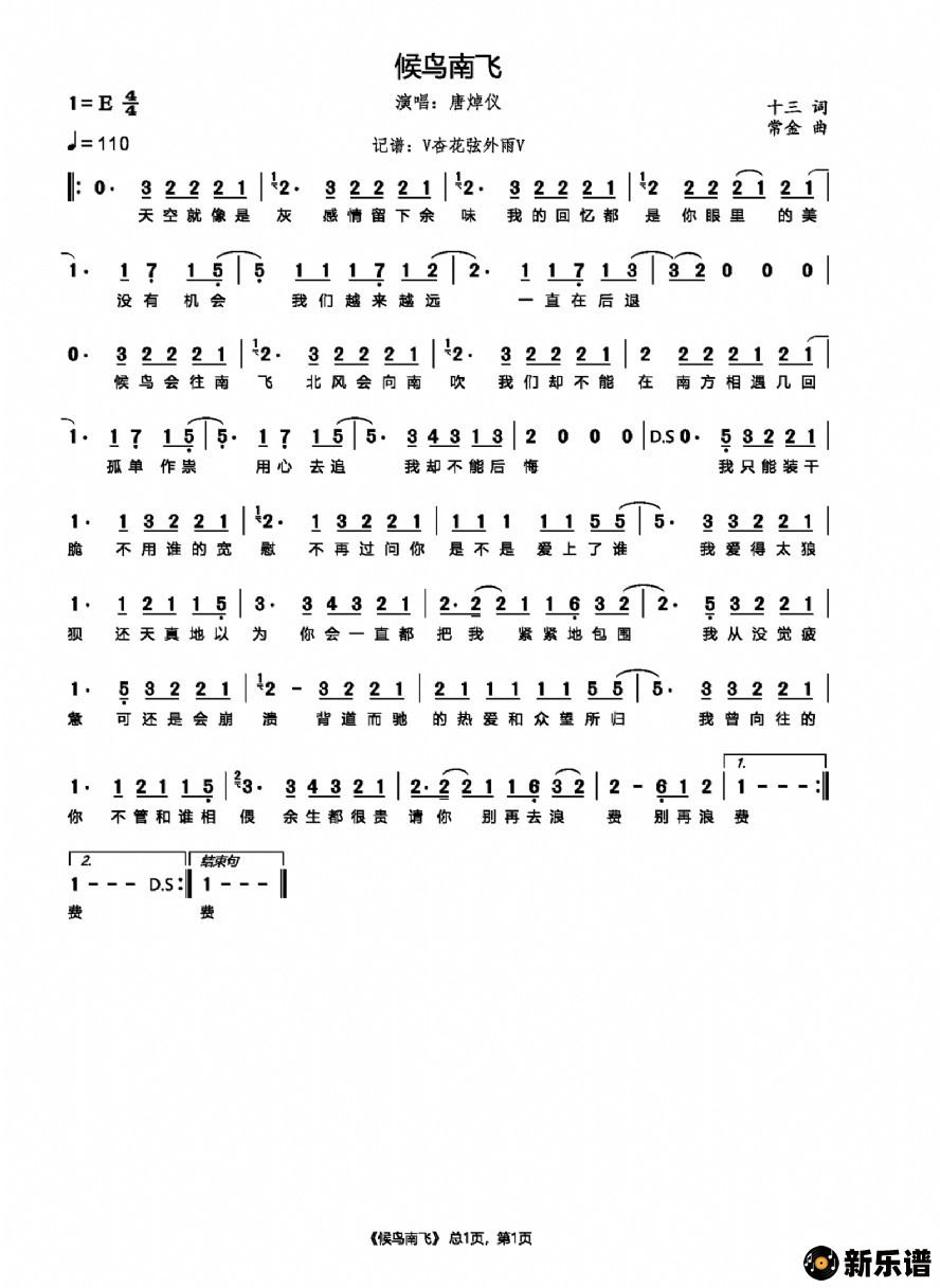 唐焯仪演唱的候鸟南飞歌词,候鸟南飞简谱.