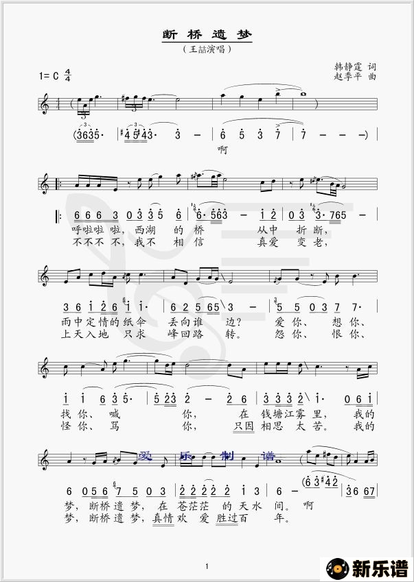 王喆演唱的断桥遗梦歌词,断桥遗梦简谱.
