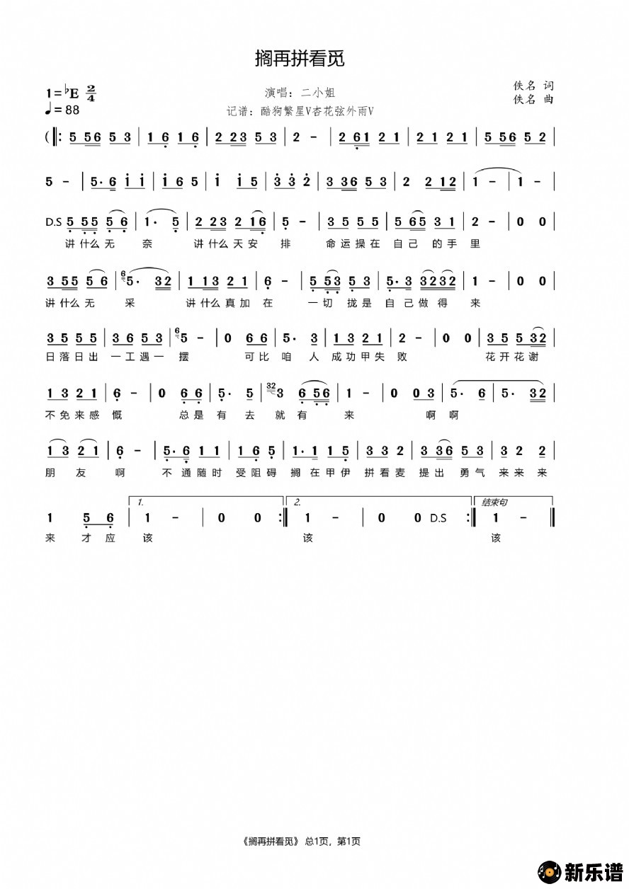 二小姐演唱的搁再拼看觅歌词,搁再拼看觅简谱.