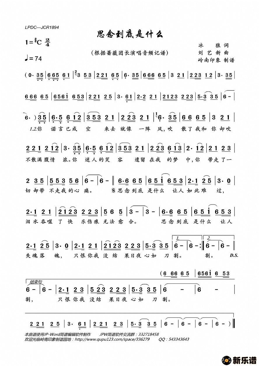 《思念到底是什么》简谱 蔷薇团长-岭南印象制谱