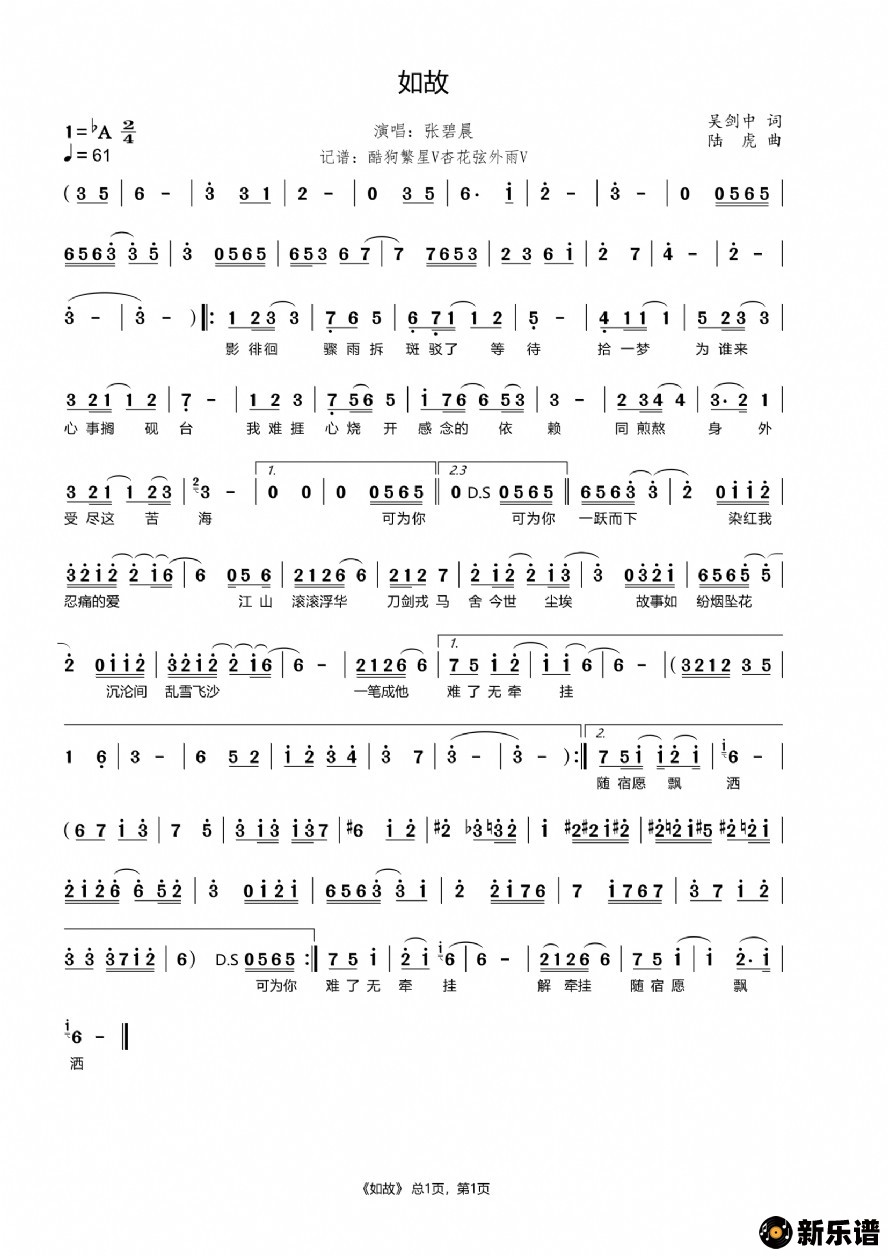张碧晨演唱的如故(《周生如故》主题曲)歌词,如故(《周生如故》主题曲)简谱.