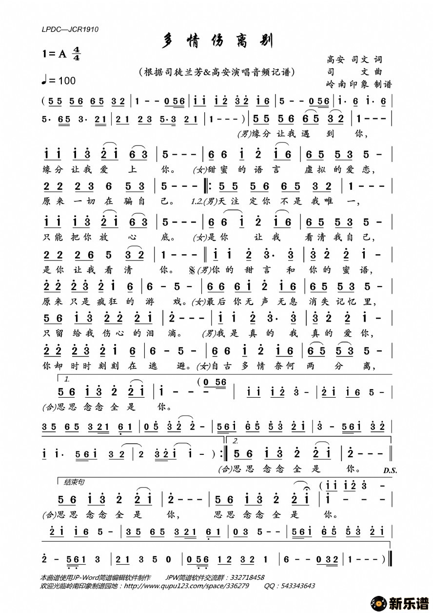 《多情伤离别》简谱 司徒兰芳&高安-岭南印象制谱