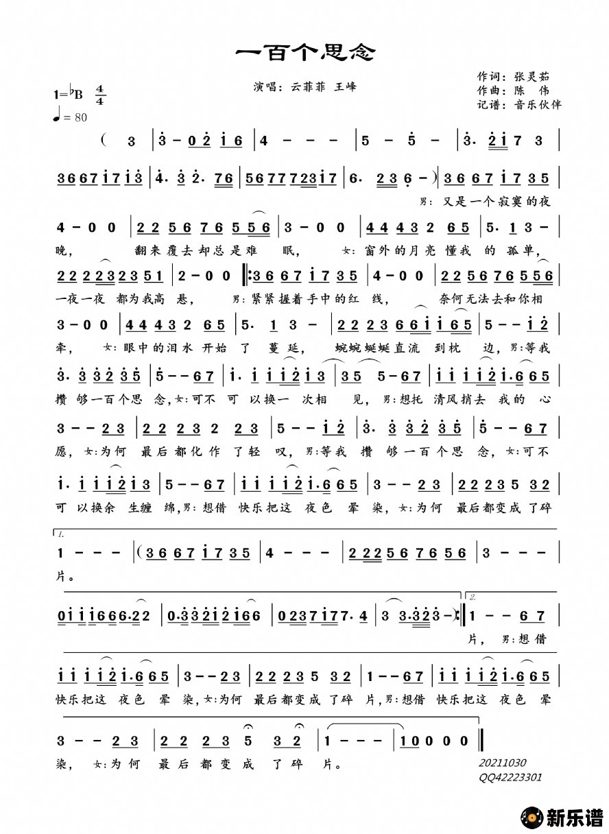 云菲菲/王峰演唱的一百个思念歌词,一百个思念简谱.