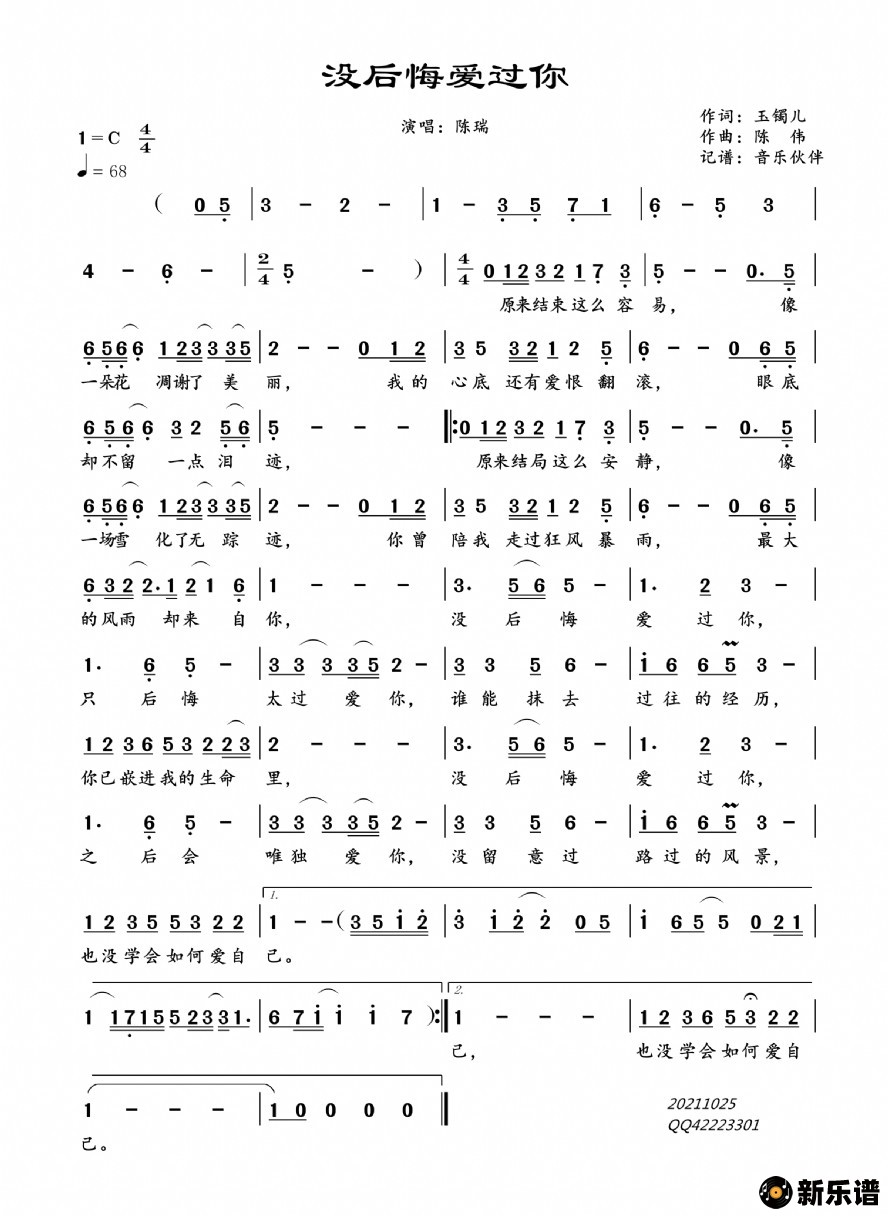 《没后悔爱过你》简谱 陈瑞-音乐伙伴制谱