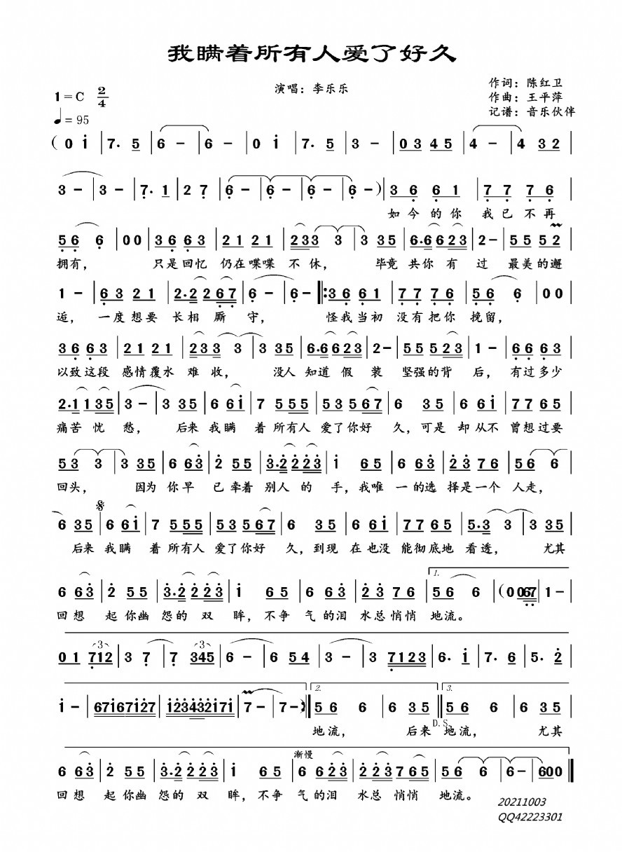 李乐乐演唱的我瞒着所有人爱了好久歌词,我瞒着所有人爱了好久简谱.
