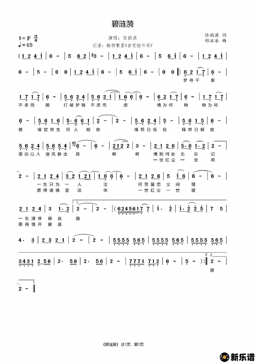 任韵淇演唱的碧涟漪歌词,碧涟漪简谱.