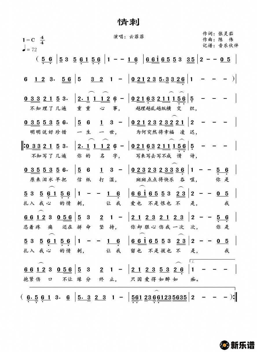 云菲菲演唱的情刺歌词,情刺简谱.