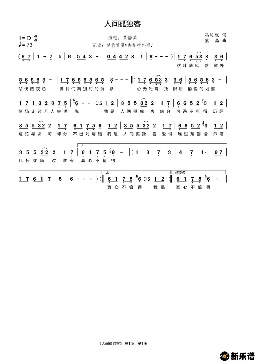 黄静美演唱的人间孤独客歌词,人间孤独客简谱.
