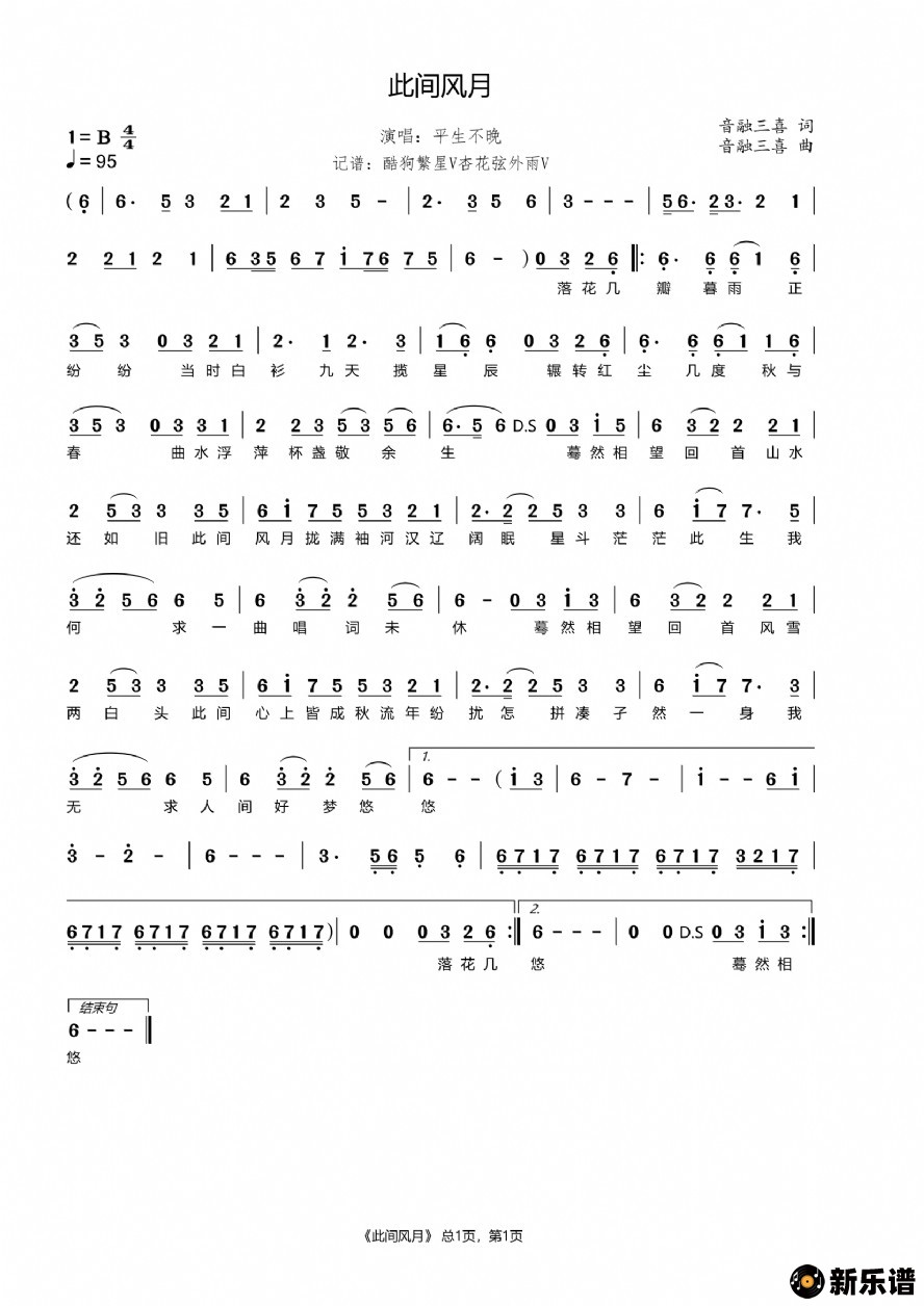 平生不晚演唱的此间风月歌词,此间风月简谱.